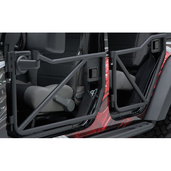 while off-road and provide a mounting location for your factory mirrors. Constructed of 1 1/4" tubular steel and are powder-coated with a durable textured finish for tough styling and protection. Both front and rear doors feature OE style latches that can be opened from inside the vehicle as well as outside. Sold in pairs.