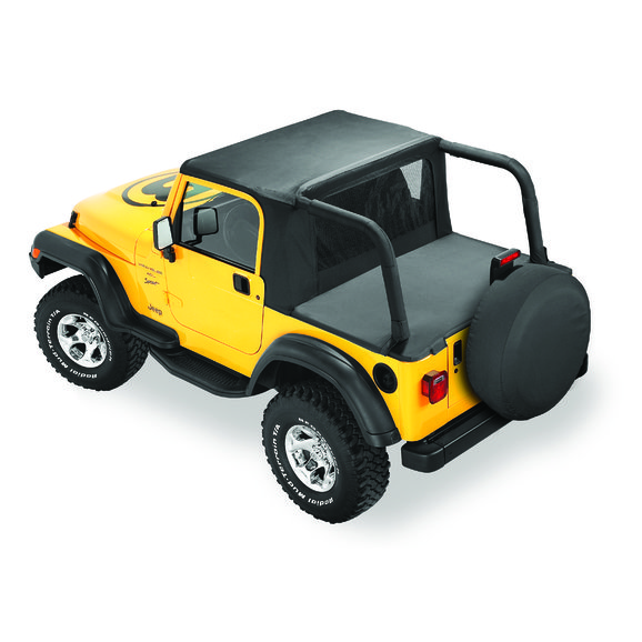 This top incorporates the best features of the popular Bikini, Windjammer, and Duster styles to make a completely sealed cockpit. It completely protects the cabin from exposure to the elements. Features the industry-leading fold-back sunroof for instant open-air driving. Rear window easily zips down for ventilation while the built-in permanent mesh screen keeps out debris. Made of mildew- and stain-resistant, premium-quality 18 oz. stretch-and-set fabric. Factory-matched colors. Industrial thread ensures a durable soft top construction. The patented Bestop Belt-Rail attachment system assures fast & easy installation. Exclusive, easy-open tailgate design allows access to tailgate without detaching rear deck of the Halftop. Hardware is galvanized & powder-coated for durability.