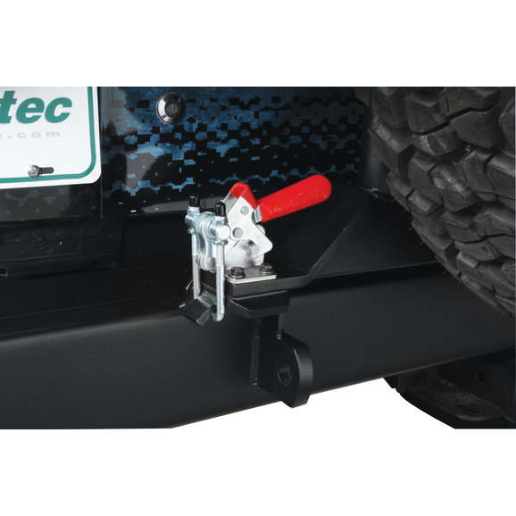 Garvin bumpers include clevis mounts that extend through the bumper and are welded on both sides for maximum strength, and can be used for vehicle retrieval. Swing-Away arm has a spring loaded pin that holds the arm in the open position. The G2 Swing Away system includes brackets to mount your Hi-Lift Jack to the inside of the swing-away. Bumpers are powder coated with a zinc primer and textured top coat for lasting durability. Bumpers are compatible with the factory receiver hitch.