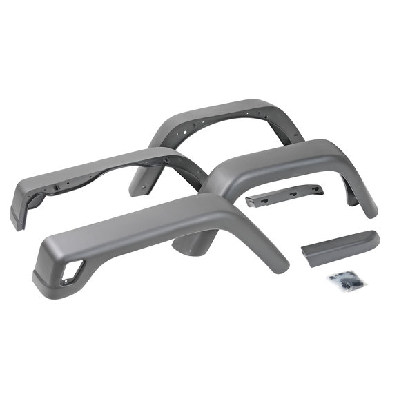 Made from lightly textured thermo plastic like the original but UV treated to prevent "chalking". Adds an additional 3.75" inches of tire coverage over the stock 3.25" wide flares.* Wrangler sets include front "dog leg" fender extensions.
