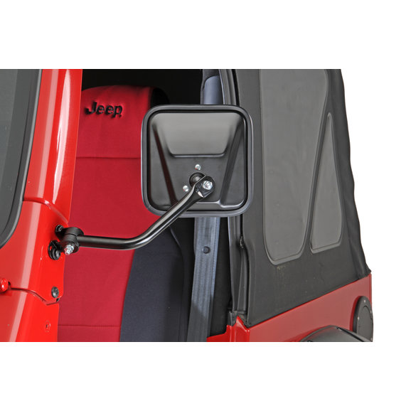 Perfect for Bestop Supertops, these rich black powder coated mirrors come with everything needed to mount a pair of Jeep-style mirrors. Fixed mounting brackets require no drilling by using existing holes. Stay street legal when putting soft doors on '97-'06 Wrangler. All mirrors sold in complete sets, including arms, all brackets and hardware.