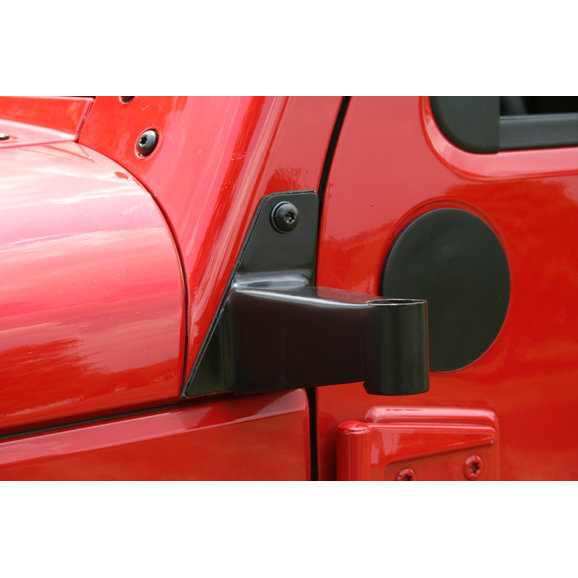 Relocate your factory mirrors with these handy brackets. The brackets piggyback your Original Hard Door mirrors to your Wrangler windshield brackets. Remove your doors without losing your mirrors! Stay legal on the street when you go to full soft doors. Sold in rich black powder-coated pairs, these brackets reuse all factory hardware at installation. The easy EZ No-drill design uses all factory holes to install. Passenger side mirror may be partially blocked with doors installed.