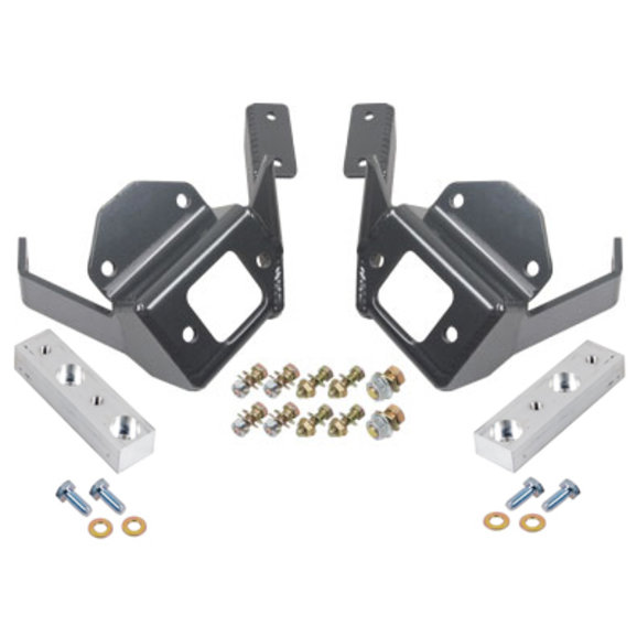 These Rear Long Travel Upper Shock Mounts relocates upper shock mount up 2" and back 2.50" which allows the use of a longer rear shock for more travel, or to regain lost up travel when moving lower shock mounts up for improved ground clearance. Designed to be used in conjunction with JK lower control arm skids w/ integrated shock mounts. Brackets come powder-coated with all necessary hardware to install. Compatible with Synergy Suspension Jeep JK Rear Upper Shock Mounts. Modification of stock exhaust will be needed to clear the factory sway bar.