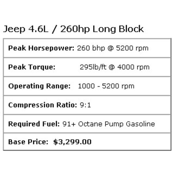 The 4.6 Jeep Stroker engine delivers tons of low end torque and will impress you every time you step on the gas, this engine was built with the daily driver in mind.