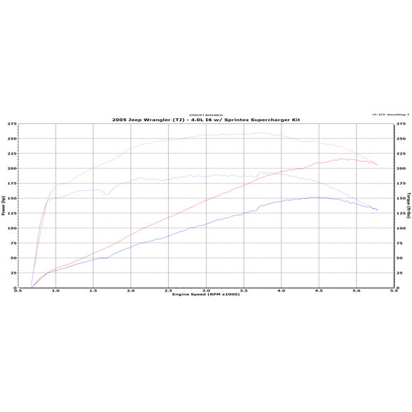 The Sprintex Supercharger System for Wrangler TJ is an easy, completely bolt-on, self-contained oiling system installation with no need for external oil lines. 42% more horsepower; 152 HP stock to 216 HP supercharged and 34% more torque; 193 ft/lb stock to 259 ft/lb supercharged. Engineered and tested to OEM specifications. Uses stock air filter housing. Completely reversible. High-quality materials and finishes. S5-210 ultra-efficient twin screw compressor for more power at lower RPM. Performance & Reliability may vary on vehicle condition and modifications, etc.
