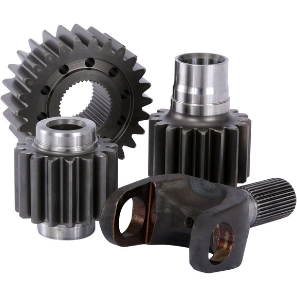 These portal axle boxes will giv your rig a whopping 4.9 inches of lift instantly for improved ground clearance. The 2.25" wide four gear design means no reverse rotation gearing required (no flipped diffs!). A 1.5:1 reduction ratio in each box for increased wheel torque without increased stress on the ring and pinion. For example a 2.73 ring and pinion will yield you a 4.09 ratio at the wheel after installation of these portal boxes. A heavy duty vented rotor with Wilwood four piston caliper is included for great stopping power. A ductile iron case is used for high yield strength and toughness. These also feature 1.5 inch diameter 35 spline input shafts and 2 inch diameter 41 spline output shafts. A Modular design means attachment knuckle can be removed and replaced for use with multiple axle housings. Drive/steer units use standard Dana 60 u-joint. Available in two-wheel steer or four- wheel steer configurations. Standard wheel bolt pattern is 8 on 6.5".