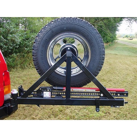 self-latching design. To close, simply push it shut. Also included is a double safety latch with hard plastic rest and rubber stop for a rattle free operation. Spring loaded auto-locking pin system. Tire carrier locks in the open position so it will not swing back at you. To close, just lift tee handle on the pin and let it swing shut. Also, notice the zerk nipple to allow greasing of the hinge bearings.