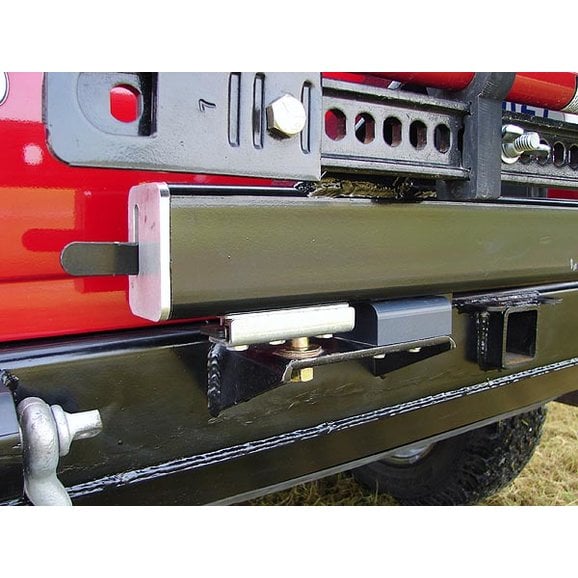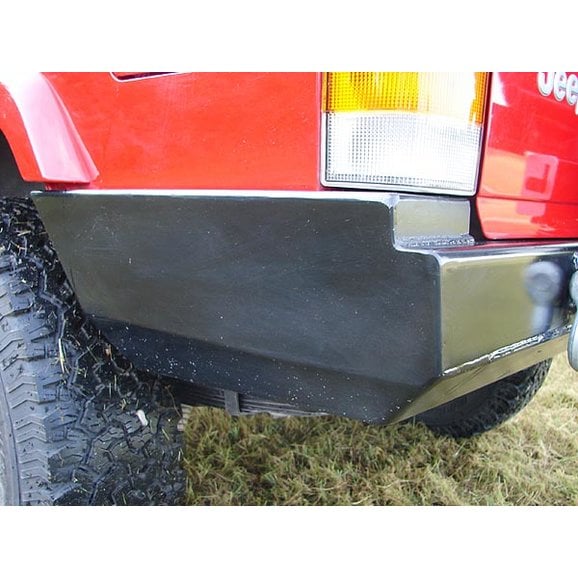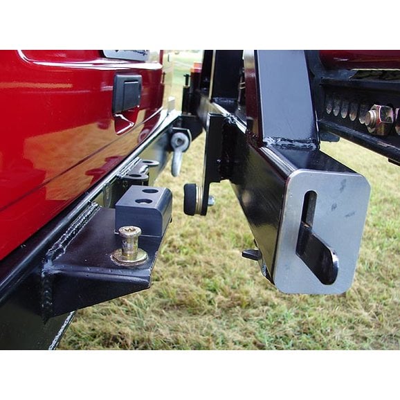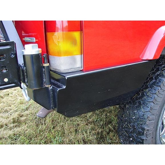 The Rock Hard Cherokee XJ Rear Bumepr has a clean installed look as though it came this way from the factory. The outter edges are made out of 1/4" steel plate. The bottom edges of the Rock Hard Cherokee XJ Rear Bumpers are beveled inward allowing for an increased departure angle and to provide a smooth ramp to slide off obsticals. Easy open latch. Just lift lever to open