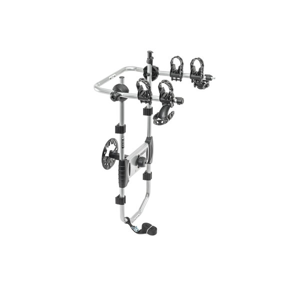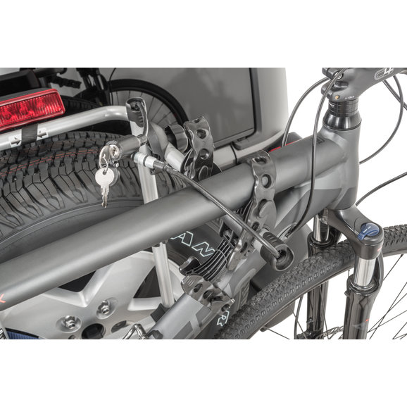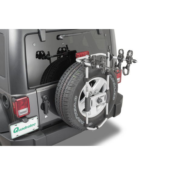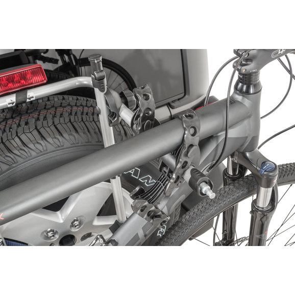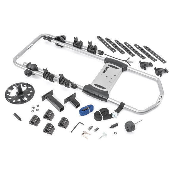 Carry up to 2 bikes on this heavy-duty lockable bike carrier from Thule. The clever design allows this carrier to be mounted through the spare tire, utilizing the factory lug nuts ensuring a snug and safe installation. The T3TM Cradles with antisway cages hold your bikes in place for maximum frame protection and stability. The Spare MeTM carrier includes a locking cable and knob to secure the bikes and carrier to your Wrangler. With the quick turn of a knob, the arms fold down when not in use. Made in the USA.