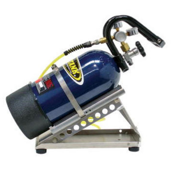 If you use your Power Tank on-the-go at the jobsite or at the track one of the biggest worries knocking your tank over. If you use a Speed Bag you can buckle the top strap around a pole or stud but if you must move it from place to place often this can get old fast. There's an easy solution called the Wedge Bracket. The Wedge holds your Power Tank at just the right angle to allow vapor at the valve and yet holds the tank low enough that it will not tip over even if you pull on the hose. To move it, just pick it up and go. Set it down anywhere as it has four rubber feet to protect the floor. The Wedge can even be used in combination with any of our Super or Power Brackets if a quick release feature is desired. All aluminum construction.
