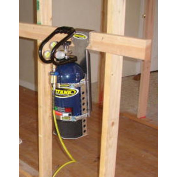 The Hangman bracket was designed originally for use on scissor lifts. Scissor lifts are tight especially when you have more than one guy up there. The last thing you want to do is trip over your Power Tank all day long. With the Hangman Bracket this problem is solved. Hang your Power Tank outside the rails or on the inside up off the floor. The lock pin ensures that the bracket cannot accidentally come off of the rail without some real effort. Fits both round and square scissor lift rails. The Hangman also fits on 2x4's and ladders.