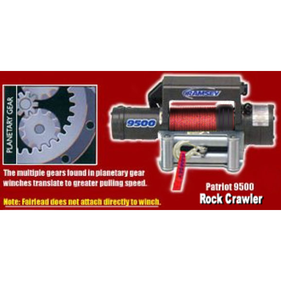 A Quadratec Exclusive! Winch shopping just got a whole lot easier! Here's the hottest new deal in winches. Introducing the Patriot 9500 Rock Crawler Edition Winch. Comes complete and is factory spooled with 100 feet of red 3/8" Technora synthetic winch line that's stronger than conventional steel cable of the same size with unparalleled benefits of use. The steel roller fairlead is replaced with a specially designed aluminum fairlead. Our combo saves you $200 and is ready to install and use. Winch line features a nylon chafe guard and an oversized winching hook.