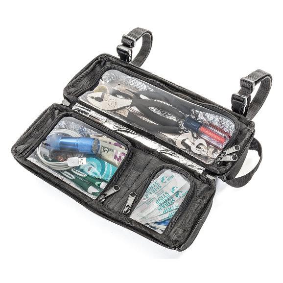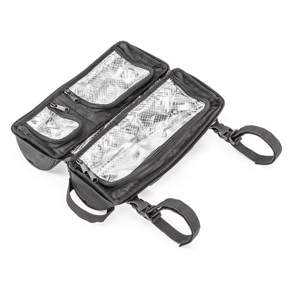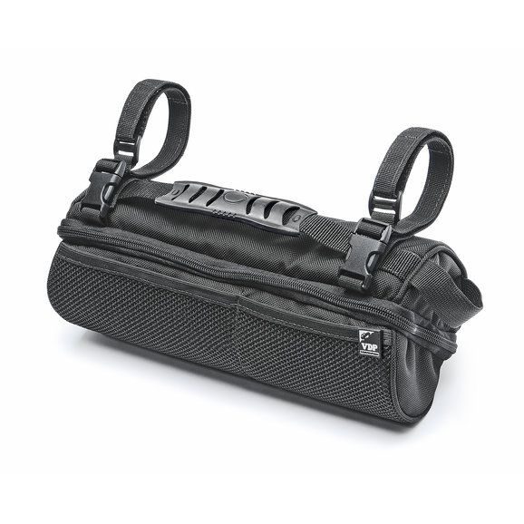Organize and see at a single glance all of your necessities for the day! This new Organizer from Vertically Driven Products zips open to expose four separate compartments with clear windows. It features outside mesh pockets for easy access to your cell phone without opening bag. Made from Armor tough Ballistic Nylon with 1/4" thick foam lining and plastic end caps this organizer is weather and Shock resistant. Snaps on or off wherever you install the mounting straps. Mounts to anything .25 up to 4" diameter roll bars, handle bars, etc. Can be used for Jeep, UTV, ATV, Motorcycle, bicycle, boat, golf cart, etc. Top and End carry handles. Tubular shape for maximum strength and great look! Buy several and keep them pre packed for everyday use, off roading, fishing, hunting, camping, biking, golfing, boating, beach, over night bag, cosmetics, travel, etc. Measures 12" x 5" x 4".