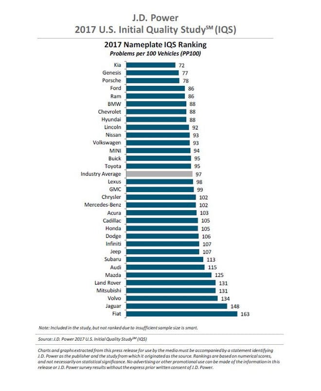 J.D. Power ranked the industry average for 2017 as 97 problems per 100 vehicles.