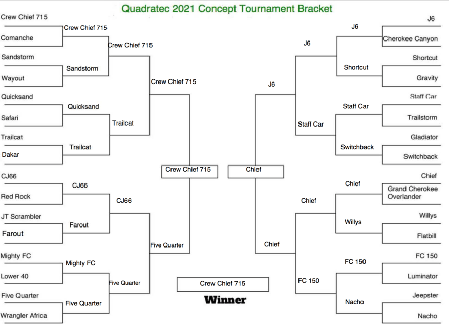 April 6 Update: Congrats to Crew Chief 715 for winning this year's Concept Tournament, as well as for everyone who voted and commented during each match. All winners below will soon receive their Quadratec Gift Cards.