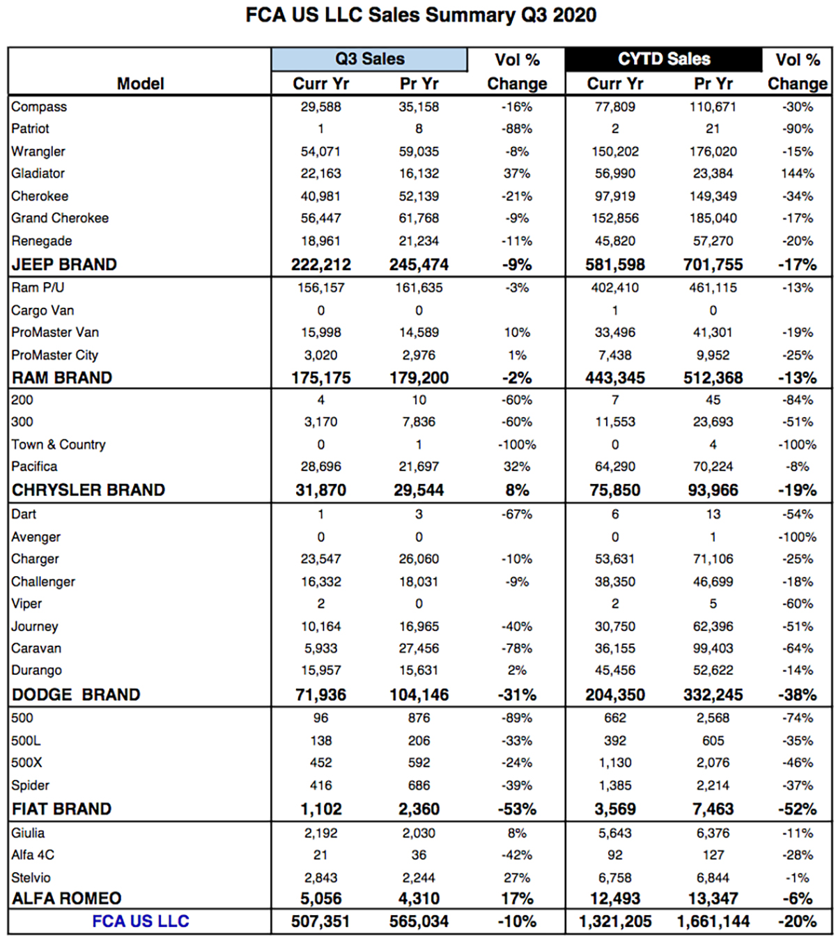 However, those total numbers are actually some good news for FCA when compared to what the company has endured so far this year. For the third quarter, FCA sold just over 507,000 vehicles, up from 367,086 in the second quarter when the automaker experienced a 27% drop.