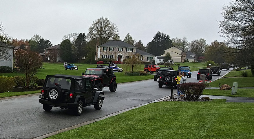 As the caravan rolled on and vehicles passed Cummings and family, it looped around a circle in the neighborhood and then filed past the house again—Jeeps passing each other at that point.