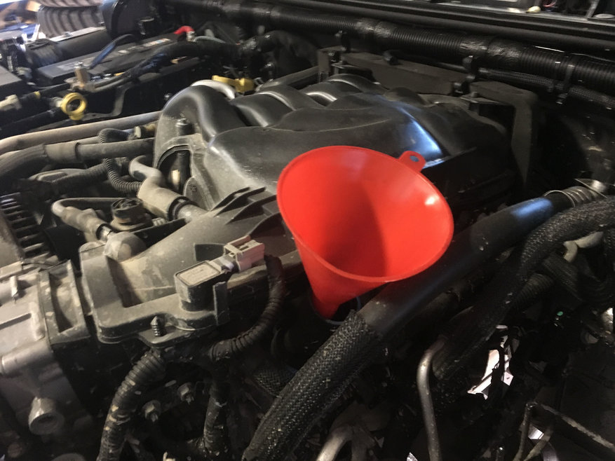 Insert your funnel into the oil filler tube and refill the engine with all six quarts of oil before removing the funnel and snugly replacing the cap. You can then start the engine and allow it to run a few minutes. Observe the oil pressure gauge and make sure it is not lit. As long as everything looks good, shut off the engine and give it a minute or two for all the oil to drain to the bottom of the engine. Check the oil level and clean up your cardboard, towels and tools. Also, please be responsible and safely dispose of that used oil. Don't just throw it in the trash.