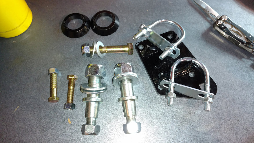 The kit comes with everything you need for installation, including Nylock nuts, anti-wobble bushings, new steering stops, and a powder-coated steering stabilizer bracket.