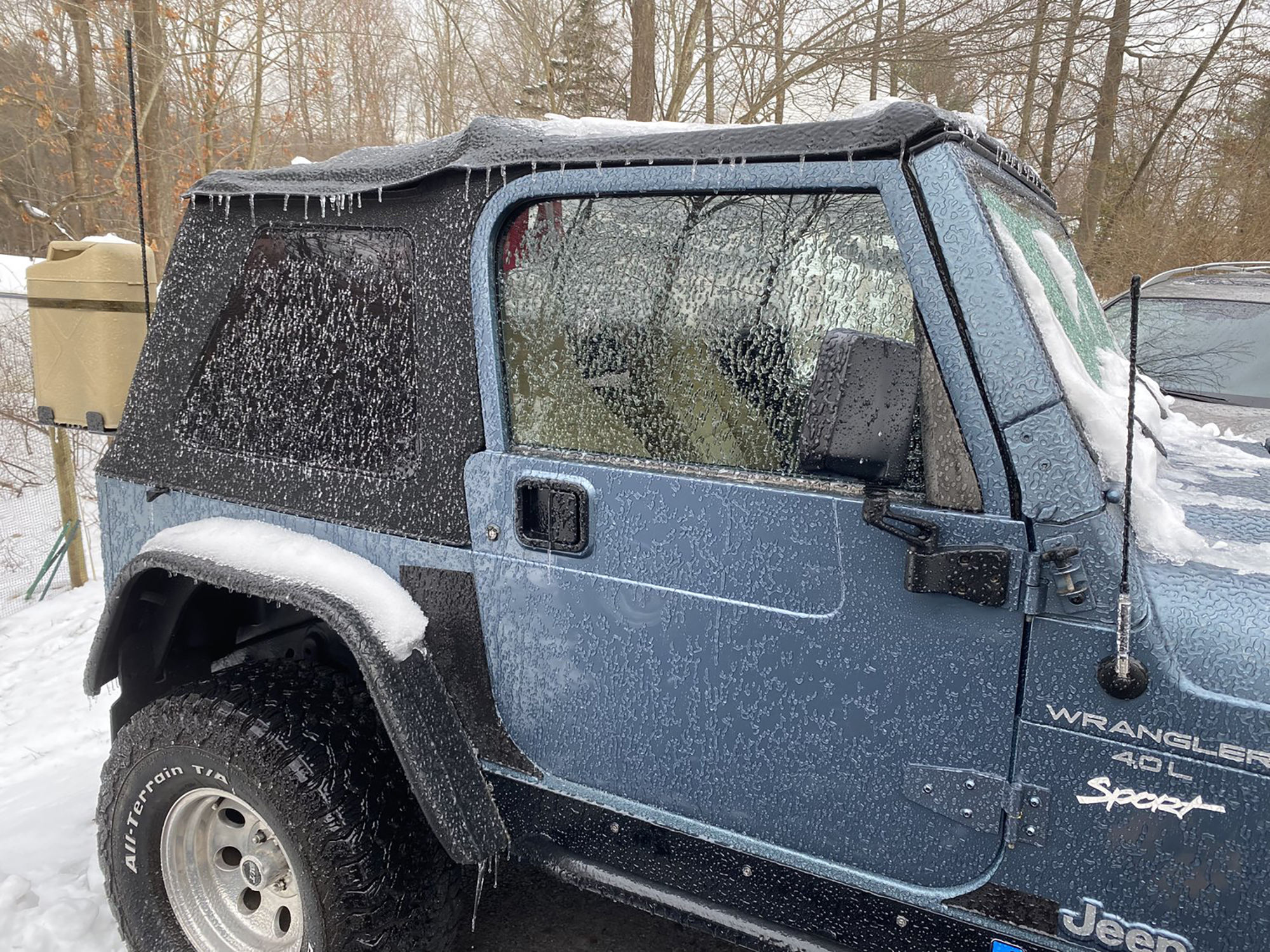 Rule number one with any soft top in the winter is never scrape off snow or ice from the side or back windows. You’ll most likely puncture the material. Always let these windows defrost first before driving.