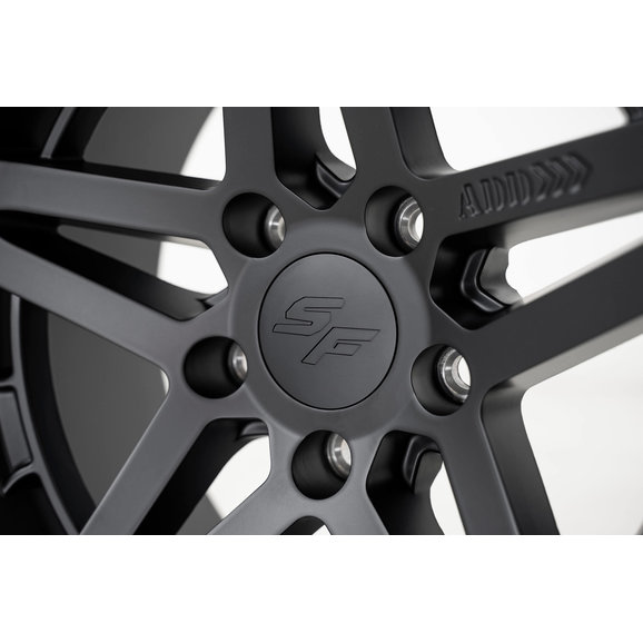 The ADD Offroad Stealth Fighter Wheel in Matte Black will both compliment your Jeep Wrangler and give it a serious off-road advantage. These 17x9 with 4.53” Backspace (-12mm Offset) wheels come in the factory 5x5” bolt pattern. This heavy duty wheel has a 2,600lb load rating which enables the wheel to hold up to the roughest terrains. ADD Offroad uses a lightweight yet resilient aluminum alloy, and corrosion and scratch resistant finish which makes for a rugged long-lasting wheel. The closed center cap has the letters SF etched into the cap for that customized look. The ten spoke, simulated beadlock design will set your Jeep apart from the rest. Lugs sold separately.