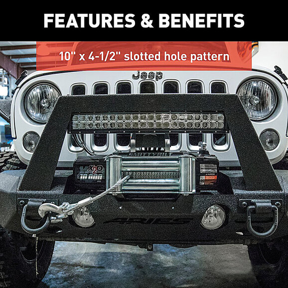 This ARIES Winch Reinforcement Bracket is exclusively designed to fit 2007-18 Jeep Wrangler JK models, and provides added strength when mounting a winch on its TrailChaser series bumper. Engineered from high-strength carbon steel and weight rated to a 9,500-pound capacity. Offers standard and slotted mounting holes to ensure compatibility with most winches. Utilizes a black powder-coated finish for superior corrosion resistance. Includes bracket and all mounting hardware. Features lifetime warranty, as well as three-year finish and one-year parts warranty.