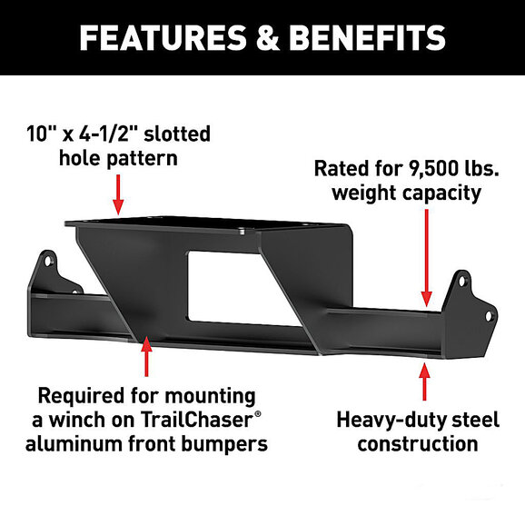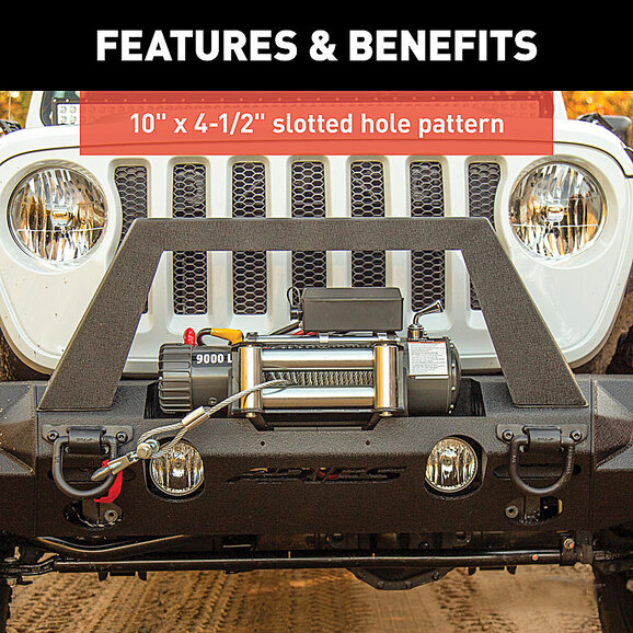 The ARIES Winch Reinforcement Bracket is innovatively designed to specifically fit 2018-23 Jeep Wrangler JL and Gladiator JT models, and provides added strength when mounting a winch on its aluminum TrailChaser series bumper. Engineered from high-strength carbon steel and weight rated to a 9,500-pound capacity. Offers standard and slotted mounting holes to ensure compatibility with most winches. Utilizes a black powder-coated finish for superior corrosion resistance. Includes bracket and all mounting hardware. Features lifetime warranty, as well as three-year finish and one-year parts warranty.