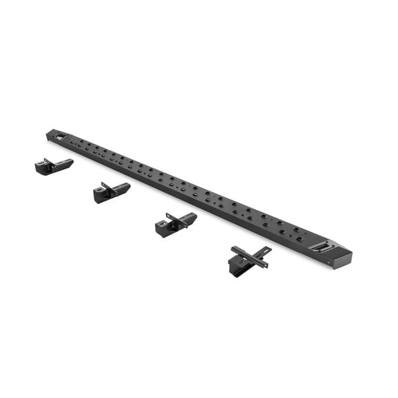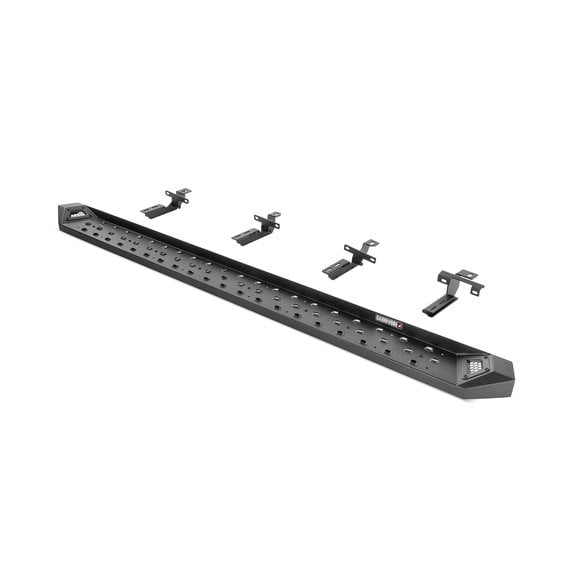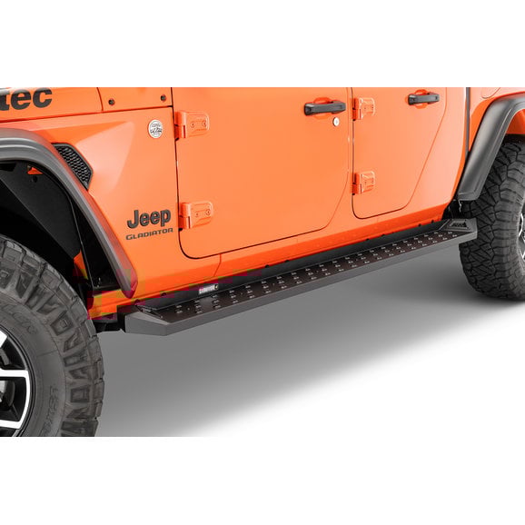 Carnivore's Side Steps for the Jeep Gladiator JT provides excellent functionality, strength, performance and appearance. These aggressively styled protective side steps measure 90 inches long and 6.25 inches wide, and offer a spacious landing area that makes entering or exiting the Jeep a pleasure — especially for those who've added larger tires or a suspension lift. Additionally, these steps provide crucial access to remove hardtop Freedom Panels, recline or remove a soft top, or when loading/unloading cargo rack items. Engineered with a unique dimple die-tread design stamped into the 2mm thick carbon steel running boards to provide superior traction in all weather conditions. Includes thick, durable steel brackets that directly attach to body mounting locations with no drilling or welding. Black textured powder coating adds long-lasting durability and an eye-pleasing appearance, while exclusive stone guards neatly match Carnivore front and rear bumpers for a uniform look. Features detailed installation instructions and a three-year warranty.