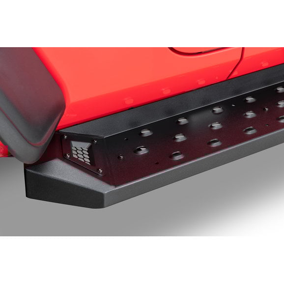 Carnivore's Side Steps for the Jeep Wrangler JL is the perfect blend of functionality, strength, performance, and appearance. These aggressively-styled protective side steps measure 72 inches long (4-Door), 54 inches long (2-door) and 6.25 inches wide and offer a spacious landing area that makes entering or exiting the Jeep a breeze — especially for those who add larger tires or a suspension lift. Additionally, these steps provide easier access to remove hardtop Freedom Panels, recline or remove a soft top, or when loading/unloading items for a cargo rack. Engineered with a unique dimple die-tread design that is stamped into the 2mm thick carbon steel running boards to provide superior traction in all weather conditions. Includes 5mm thick steel brackets that directly attach to body mounting locations with no drilling or welding required. Black textured powder coating adds long-lasting durability and an eye-pleasing appearance, while exclusive stone guards at each end of the steps neatly match Carnivore front and rear bumpers for a uniform look. Features detailed installation instructions and a three-year warranty.