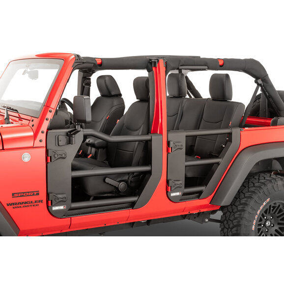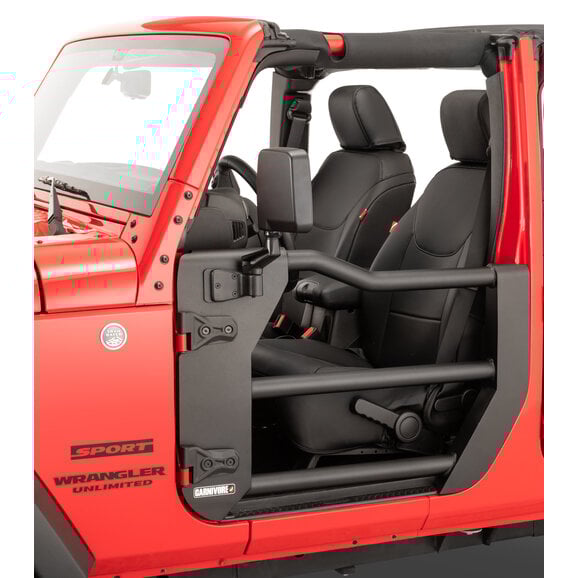 Feel the open air as you hit the trails & the pavement in your Wrangler JK with the Carnivore Tube Doors. Our doors include two-stage rotary latches that reduce vibration and rattling. The 2” diameter steel tubes and contoured sheet metal construction nicely follow the door openings and body contours. Carnivore's Tube Doors also include adjustable door check straps and the custom cast metal hinges utilize your factory door retention nuts for added security. The textured black powder coat finish looks great with any color vehicle and provides lasting durability. Not compatible with factory mirrors, please see the recommended section for compatible mirrors.