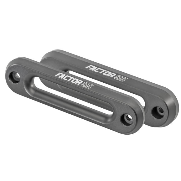 Factor 55 introduces a new line of Aluminum Hawse Fairleads. The 1.0 and 1.5 fairleads are CNC machined from 1 and 1.5 inch thick USA 6000 series aluminum bar. The industry standard fairlead thickness is .75 inches thick. The thicker aluminum bar results in a larger outer fillet radius for the synthetic rope to slide against. This results in less stress on the rope fibers during high angular pulls, increasing the life of your synthetic rope. The 1.0 and 1.5 fairleads are the industry's first Hawse fairleads compatible with larger ½ inch diameter rope tube thimbles. The rope slot height opening is taller to allow the larger ½ tube thimbles to pass through. There is also a machined outer corner champ fer to reduce rope stress for those than plan on using the winch as a front suspension suck down device. These fairleads come in a durable MIL-A-8625F TYPE III gun metal gray hard anodized finish with a machined logo.For synthetic winch rope only.