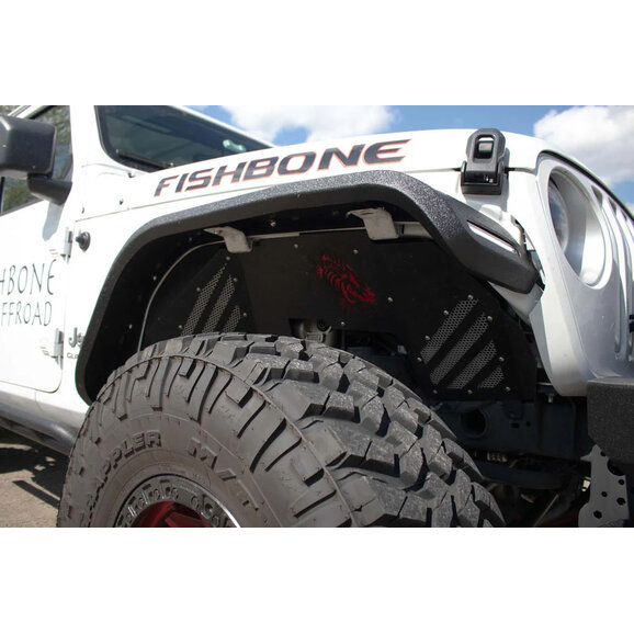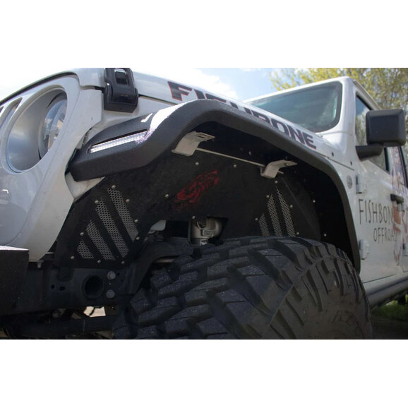 The Front Elite Tube Fenders for the Wrangler and Gladiator are designed to increase clearance for larger tires and set your Jeep apart from the crowd. Engineered to mount to existing locations on the body these one-piece fender and flare replacements add a distinctive look while offering factory width coverage. Your choice of steel, for superior strength, or aluminum for weight reduction, each kit includes plug and play LED lighting and stainless hardware for a hassle free installation. Featuring the iconic Fishbone logo laser-cut into the plate acting as a cover for the fender vent. Finish off the look with Fishbone fender liners, available separately.