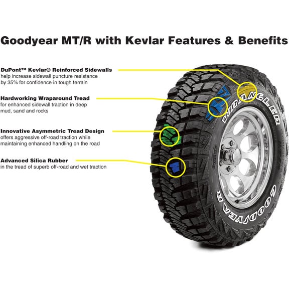 The Wrangler MT/R with Kevlar is Goodyear's first off-road tire to incorporate DuPont™ Kevlar®, an innovative material that's, pound for pound, five times stronger than steel. The Innovative use of Kevlar brings superb sidewall cut and puncture resistance to an area of the tire that demands extra toughness when driving off-road. It also helps reinforce the sidewall for when driver's return to pavement. No longer available with outlined white letters, black wall only.