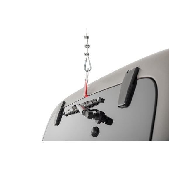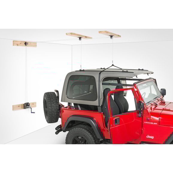 Safety Storage: Thanks to the Hoist-A-Top's strong steel cables, your Jeep’s top is easily stored up and out of the way once you’ve removed it from the vehicle.