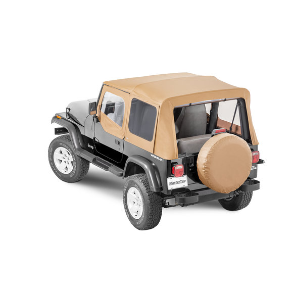 MasterTop Replacement tops for ’88-‘95 Wrangler Soft Tops are designed to fit over your factory-installed soft top bow assembly (not Included). Each top includes all the custom fit heavy-duty OEM approved HAARTZ® Brand 28 oz Sailcloth Vinyl fabric, Door Skins, and replaceable windows needed to do a complete replacement of that old, worn top. MasterTop Soft Tops use High-quality scoop count OE matching zippers that allow for easy removal and replacement of side and rear windows. MasterTop Replacement tops for ’88-‘95 Wrangler Soft Tops come with Soft Upper Door skins constructed with DOT approved Clear glass that easily slips over your factory metal half-door frames. This high-quality Soft Top is available in your choice of Black Diamond or Spice Diamond Material. All MasterTop windows feature extra-thick 40 mil press polished tinted glass with 31% tint for the ultimate in clarity and longevity. By using only the highest quality materials, MasterTop replacement tops have set the new standard in replacement top design.