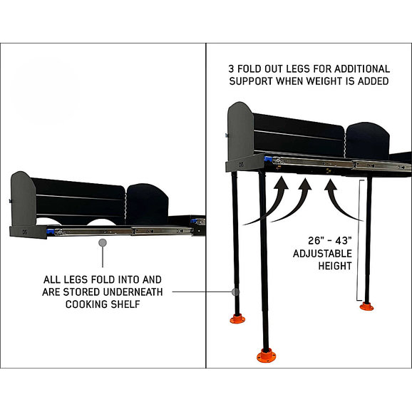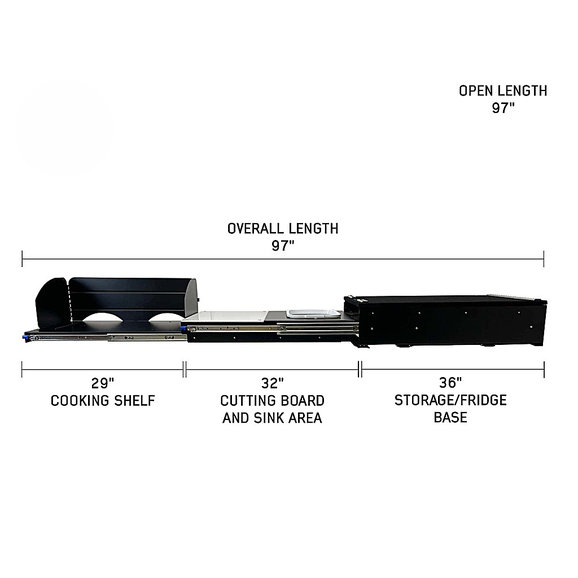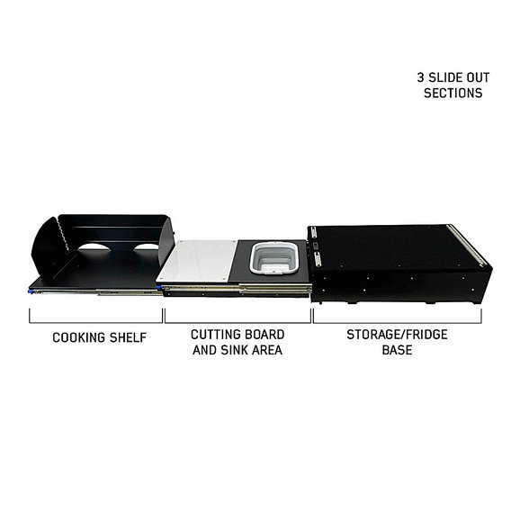 Overland Vehicle Systems' Cargo Camp Kitchen can easily accommodate all your overlanding adventures. Built from aircraft-grade aluminum and marine-grade stainless steel, it is engineered to stand up to any environment and is perfect for just about any portable BBQ system on the market — like Coleman, Pitboss, Masterbuilt, Cuisinart, Char-Broil, Weber, Blackstone, Nomad, and many others. Includes three slide outs; a cooking shelf, work station and refrigerator slide to prepare all kinds of meals on the go. Stores nicely inside included cargo box and has a total of three latched locked slides. Sink is removable, collapsible and engineered to hold water. Legs can extend from 26" to 43" and kitchen includes reversible 3-sided wind protector. Simple installation with three rows of mounts with 18 different slot positions. Five-year limited warranty.