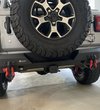 Large Spare Tire Opening w/ Non-Slip Step: This large opening will allow for use with larger spare tires. Measuring 25" at the top and descending 4" to a width of 18.5" at the bottom. We also incorporated a dimpled landing pad 18" x 5" to be used as a step allowing you to load up a roof rack with ease once the spare tire is hinged open. Giving you ample space for both feet with grip.