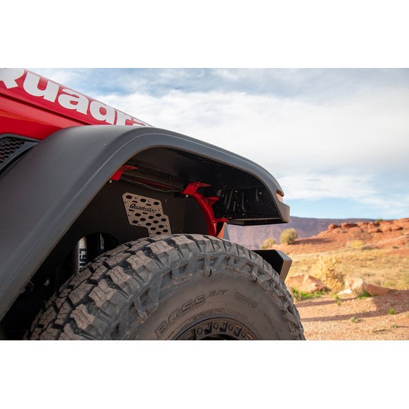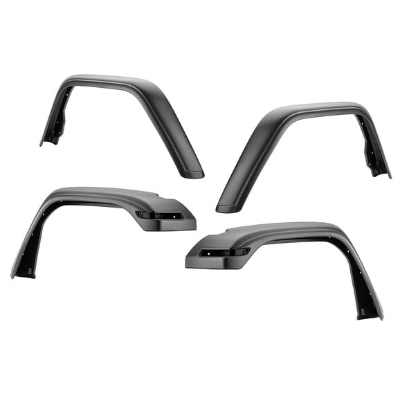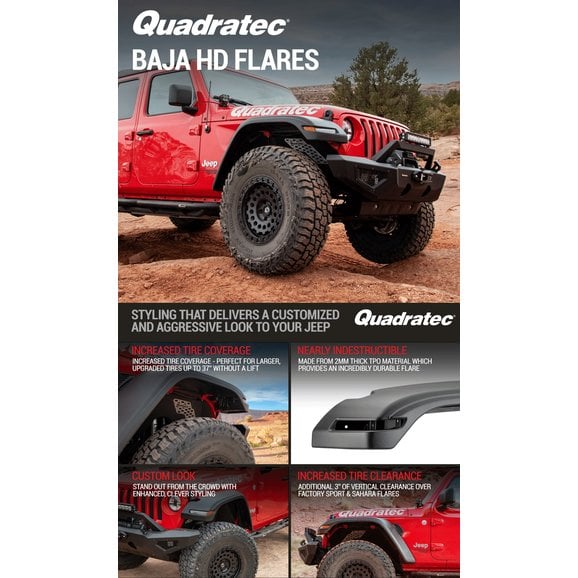 Our rugged Baja HD Fender Flares for the Jeep Gladiator JT offer the same tire coverage as factory Rubicon flares, measure 5/8" wider than Sport flares, while providing an additional 3” of vertical tire clearance over Sport and Sahara factory versions. This extra height and width mean you’ll have the coverage and room for most oversized tire and wheel setups. Flares come complete with hardware and detailed installation instructions and offer a finished black 2mm thick thermoplastic material that’s virtually indestructible. They install without factory inner fender liners, enabling the use of many custom metal inner fender liners (sold separately) and work with existing factory turn signal and DRL assemblies — making them completely DOT compliant. Some modification is required. Flares include front and rear pairs, brackets and all needed hardware. Three-year limited warranty.