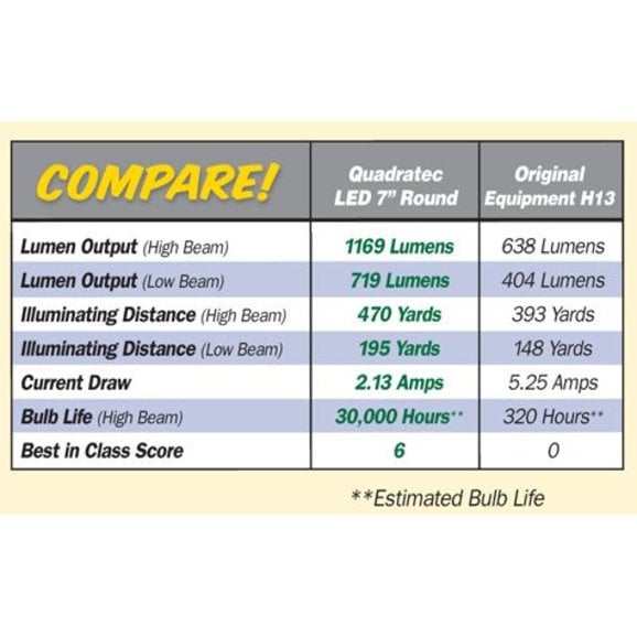 Low and High Beam LED Strength: Quadratec Generation II LED Headlight low beams produce 81% more lumens and have a 92% higher illuminating distance versus standard factory lighting, while high beams produce 88% more lumens with a 61% increase in illuminating distance.