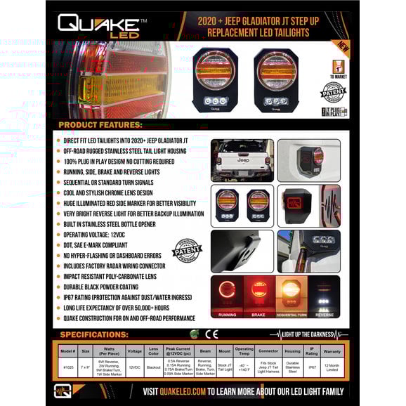Quake Tempest LED: Providing enhanced visibility for a safer driving experience with a plug and play installation. These premium lights provide a bulb-free headlamp design that is waterproof and extremely durable against potential trail damage. Constructed with a military grade, die-cast aluminum housing and polycarbonate lenses that will Not yellow. Giving optimum protection against the abuse of road debris, and impact from branches on the trail. Sealed with reinforcement grade epoxy that protects the innards from corrosion and moisture. Engineered with advanced circuitry to protect against voltage spikes. Quake offers a quality that is built to last.