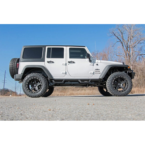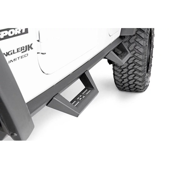 Vehicle Specific Design: The Rough Country Contoured Drop Steps are engineered to fit all JK Unlimited Wranglers. They are compatible with all four door models, regardless of trim package or factory options. If your Jeep has factory Rubicon Rock Rails, then they will have to be removed prior to installing the Contoured Drop Steps.