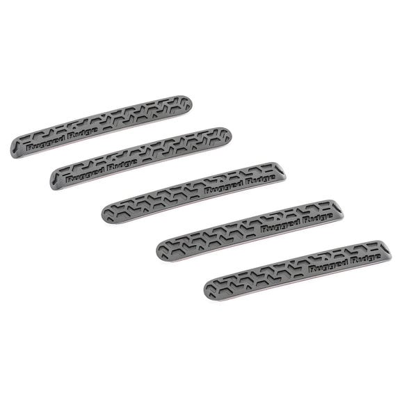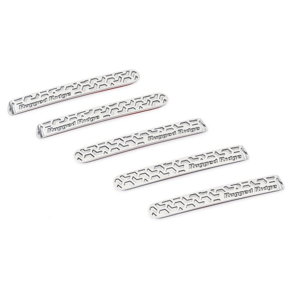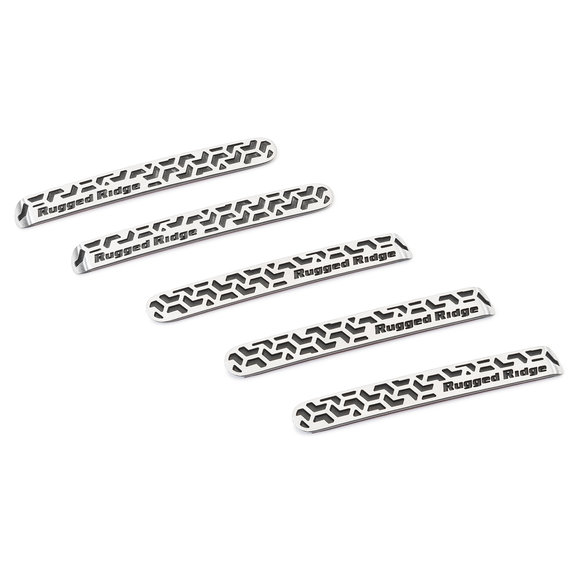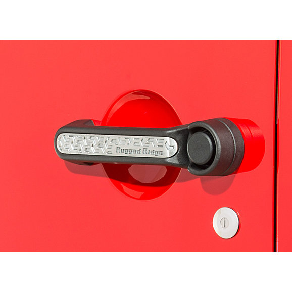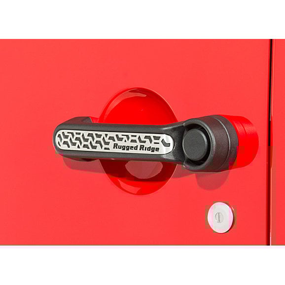 Bring a tasteful off-road accent to your JK with Rugged Ridge Elite Door Handle Inserts featuring a cool tread-inspired inlay. Each insert is made from lightweight cast aluminum and treated to a fine textured powder coat for durability or a lustrous brushed finish giving an eye-catching custom touch to your rig. Kit Includes 5 inserts, for both doors and rear tailgate. These inserts install with ease with double-sided automotive tape. No sharp edges result in a comfort-fitting install.