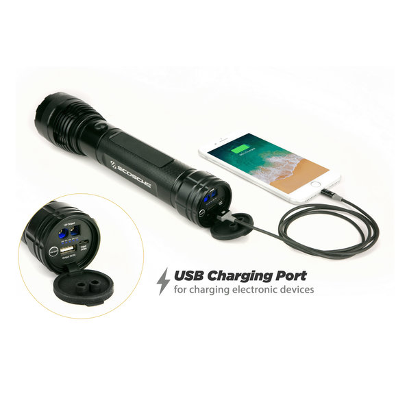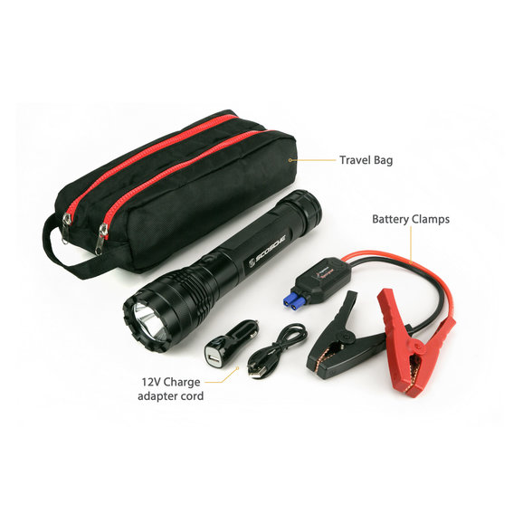 The PowerUp 400 portable LED flashlight & car jump starter is versatile and packed with useful features. This portable powerhouse features a 5,100 mAh 400A battery, that is capable of starting a low or completely dead battery to get you back on the road. The 1,000 Lumen LED flashlight has 3 different light level modes, including SOS mode that will strobe in emergency situations. The PowerUp 400 can stay charged for up to 6 months, assuring you that it will be ready when you need it. With 10 built-in safety protections, the jump starter will keep you and the vehicle safe from overheating, polarity, and any sparks that may occur. Quickly charge up a USB compatible portable device via the 5-volt USB port. The body of the PowerUp 400 shows the battery level at low, 40%, 60%, 80%, or full charge. Backed by Scosche's Lifetime Tech Support and 1-year warranty.