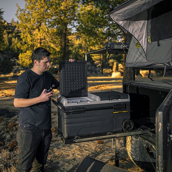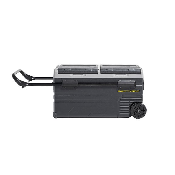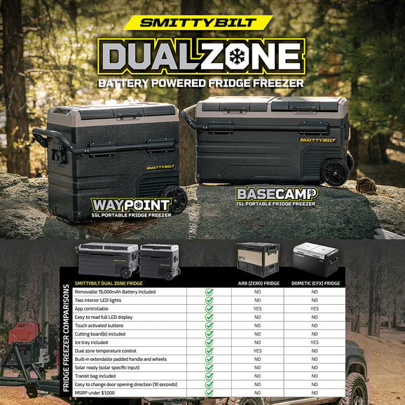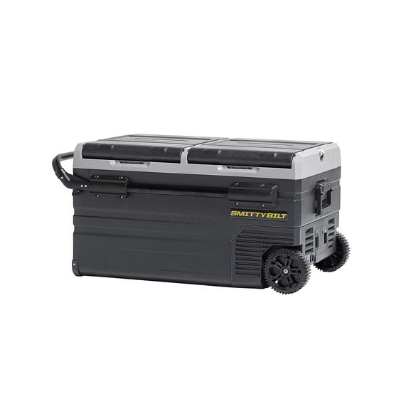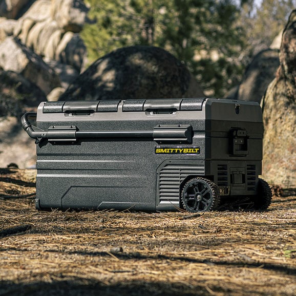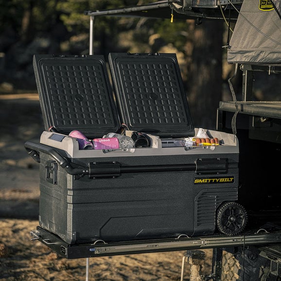 The Smittybilt Basecamp 75L Fridge Freezeris the battery-powered mobile fridge and freezer combination to allow you to ditch the bags of ice to keep your beverages and food cold while out on the trail. This 75-liter, dual zone fridge is feature-rich including removable wheels, extendable handles, dual-zone freezing and cooling capacity and allows for smartphone control through Bluetooth connectivity. The removable battery can be recharged by 12-volt accessory or is solar panel ready. Spare batteries are available to purchase to get even more battery life. The easy-to-read LED touch screen makes adjusting the temperature a breeze. Hold all your beverages in this state-of-the-art fridge for your next adventure.