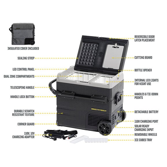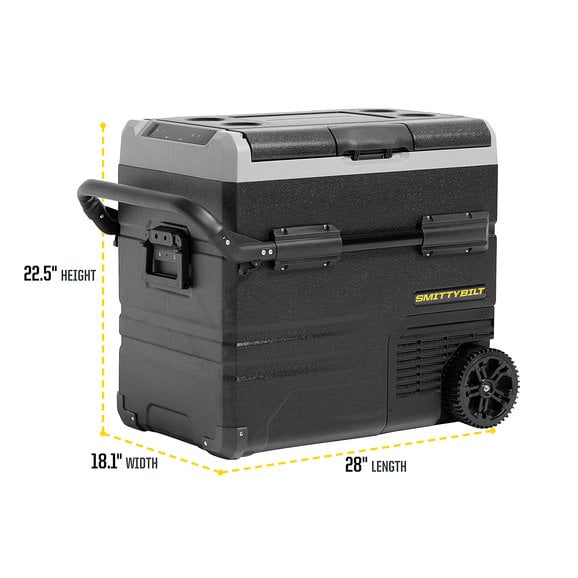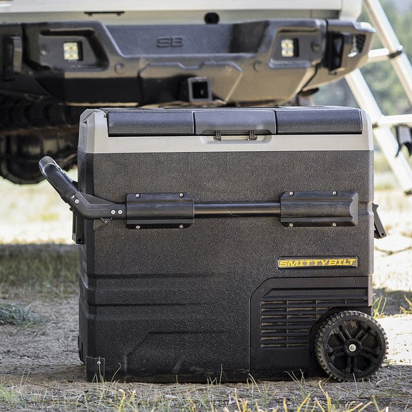 The Smittybilt Basecamp 75L Fridge Freezeris the battery-powered mobile fridge and freezer combination to allow you to ditch the bags of ice to keep your beverages and food cold while out on the trail. This 75-liter, dual zone fridge is feature-rich including removable wheels, extendable handles, dual-zone freezing and cooling capacity and allows for smartphone control through Bluetooth connectivity. The removable battery can be recharged by 12-volt accessory or is solar panel ready. Spare batteries are available to purchase to get even more battery life. The easy-to-read LED touch screen makes adjusting the temperature a breeze. Hold all your beverages in this state-of-the-art fridge for your next adventure.