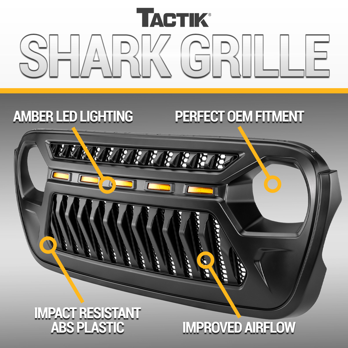 Elevate your Jeep’s style and visibility with the TACTIK Reef Shark Grille with Amber LED Lighting for Jeep Wrangler JL & Gladiator JT models. This bold aftermarket grille combines aggressive design with integrated amber LED accent lighting for a head-turning appearance both day and night. The sinister styling, inspired by military-grade performance, adds serious attitude to your front end while improving safety by enhancing visibility during low-light conditions or off-road excursions. It's the perfect blend of function and form, giving your JL or Gladiator an unmistakable presence on any trail or city street.