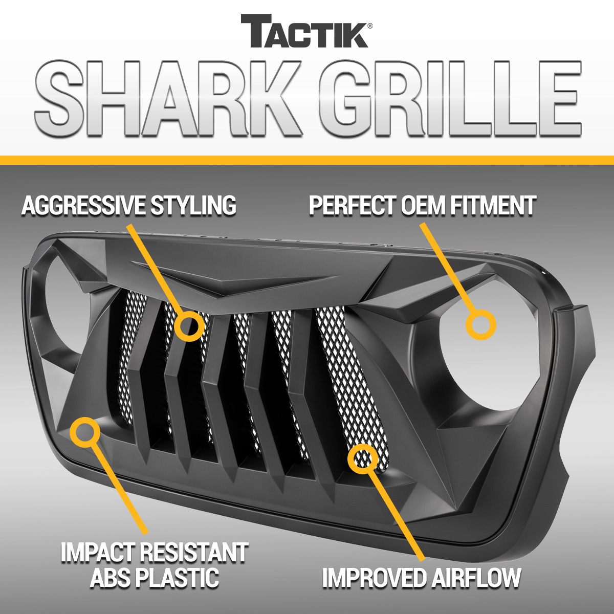 Transform the front end of your Jeep with the TACTIK Tiger Shark Grille designed for the Jeep Wrangler JL & Gladiator JT (excluding TrailCam-equipped models). Featuring an aggressive, battle-ready design, this grille instantly gives your JL or Gladiator a bold new look that commands attention on the street or trail. With sharp contours and a rugged mesh insert, the Gladiator Grille enhances airflow to your engine while adding a tough, off-road-inspired aesthetic that Jeep enthusiasts love. It’s the ideal upgrade for drivers looking to combine function with aggressive styling.