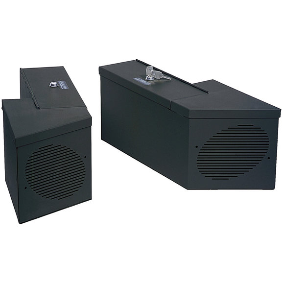 Turn that unused space on top of the wheel wells into a convenient and secure place to mount 6"X9" speakers, and lock up valuables. This 16-gauge steel lock-box set comes equipped with a removable partition which divides the speaker and storage area. Available With Upgraded Combination Lock or original Cam Style Lock.