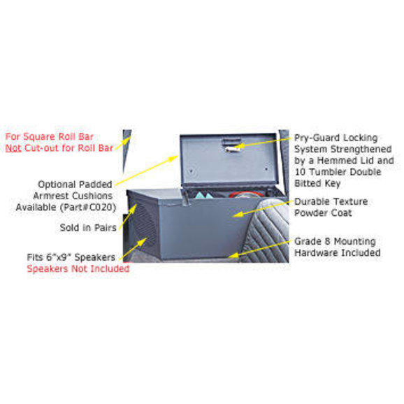 Turn that unused space on top of the wheel wells into a convenient and secure place to mount 6"X9" speakers, and lock up valuables. This 16-gauge steel lockbox set comes equipped with a removable partition which divides the speaker and storage area. Available With Upgraded Combination Lock or original Cam Style Lock.