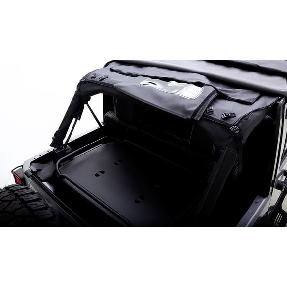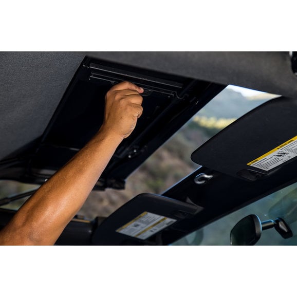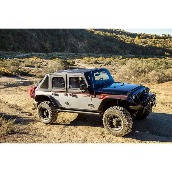 The Rampage TrailView soft top is a revolutionary design that features a patent pending retractable sunroof that can be opened with one hand from the inside of the Jeep for open air driving. The removable tinted rear and side windows quickly convert the soft top into a safari style top. The built in window storage keeps your windows protected and at the ready when removed. The premium 30oz sailcloth fabric provides a quiet ride and is UV and mildew resistant.